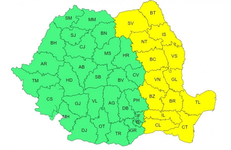 Meteorologii au emis o atenţionare cod galben de vânt, polei, ninsori moderate cantitativ şi viscol pentru Moldova, Dobrogea şi jumătatea de est a Munteniei începând de duminică după-amiază până marţi dimineaţă. De asemenea, anunţă ger în nord, centru şi est, cu minime termice de până la -20...-18 grade în noaptea de marţi spre miercuri.