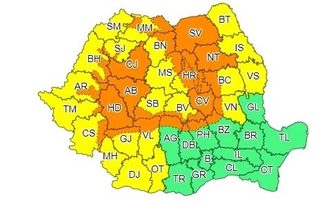 În Banat, Crișana și Transilvania, iar spre seară și noaptea mai ales în Oltenia și Moldova va fi instabilitate atmosferică ce se va manifesta prin perioade cu intensificări de scurtă durată ale vântului, rafale în general de 60...70 km/h, vijelii, averse torențiale, descărcări electrice și izolat grindină. Cantitățile de apă vor fi de 20...25 l/mp și izolat 30...40 l/mp.