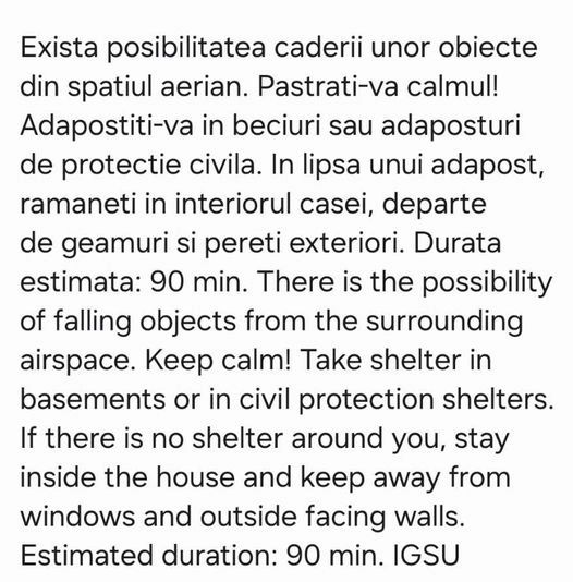Un mesaj de tip RO-Alert i-a avertizat pe oameni că exista posibilitatea să cadă obiecte din cer, asa ca acestia au fost sfatuiti să se adăpostească în beciuri sau adăposturi de protecție civilă.