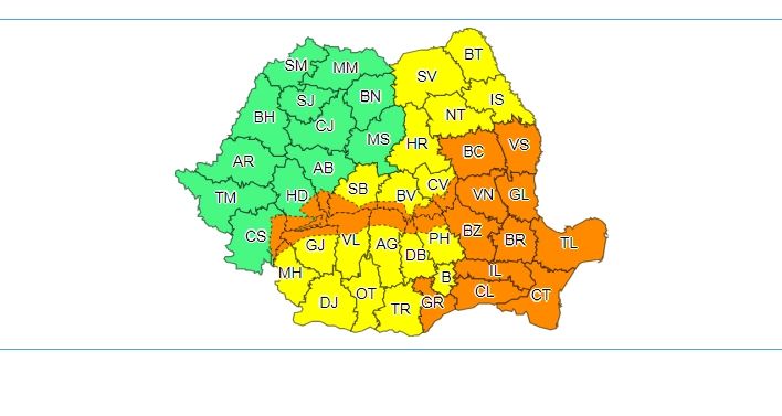 ”În judeţele Călăraşi, Ialomiţa, Brăila, Buzău, Tulcea, Constanţa, Vrancea, Galaţi, Vaslui şi Bacău va ninge şi va fi viscol. Vântul va avea intensificări susţinute cu rafale în general de 85...90 km/h, iar vizibilitatea va scădea sub 50 m. În Carpaţii Meridionali şi de Curbură vor fi intensificări susţinute ale vântului cu rafale de 90...110 km/h, va ninge şi va fi viscol iar vizibilitatea va scădea sub 50 m”, precizează ANM.
