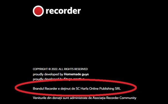 În realitate, după cum scrie într-un colț mic al secțiunii “Despre noi”, brandul Recorder este deținut de o firmă obscură cu denumire bizară – Harfa Online Publishing SRL. Firma, care asigură și editarea publicației, adică administrează întreaga afacere, a fost înființată în 2017.