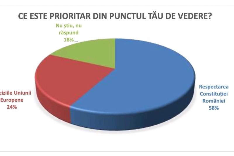 Potrivit aceluiași sondaj, românii sunt dezamăgiți de felul în care este condusă țara și susțin că lucrurile merg într-o direcție greșită. Totodată, cei chestionați văd prioritară respectarea Constituției României.