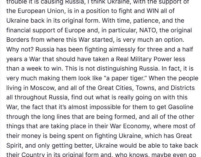 „După ce am înțeles pe deplin situația militară și economică dintre Ucraina și Rusia și după ce am văzut problemele economice pe care le cauzează Rusiei, cred că Ucraina, cu sprijinul Uniunii Europene, se află într-o poziție de a lupta și a RECÂȘTIGA întreaga Ucraină în forma sa originală. Cu timp, răbdare și sprijin financiar din partea Europei și, în special, a NATO, granițele originale de la care a început acest război sunt foarte mult o opțiune. De ce nu? Rusia a luptat fără scop timp de trei ani și jumătate într-un război pe care o putere militară reală l-ar fi câștigat în mai puțin de o săptămână. Acest lucru nu este o dovadă de excelență a Rusiei. De fapt, îi face să pară „un tigru de hârtie.”